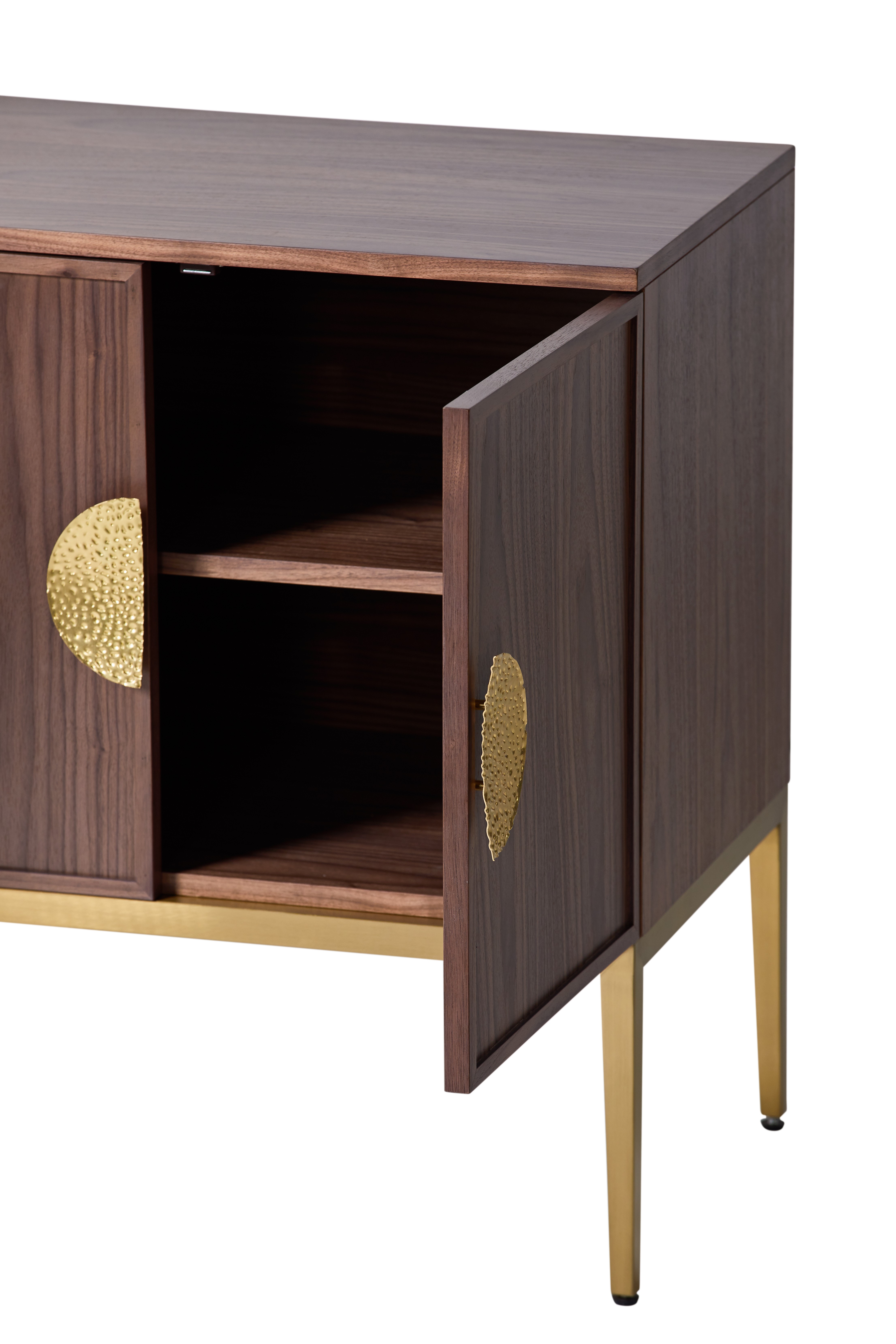 El gabinete moderno RJT-9715 es extremadamente versátil y puede funcionar como un aparador, una unidad de almacenamiento contemporánea o un buffet para cualquier espacio de oficina o vivienda elegante. El espacioso mueble está dividido en dos armarios dobles y un inspirador medallón de metal dorado incrustado a modo de tirador.